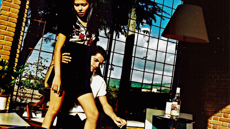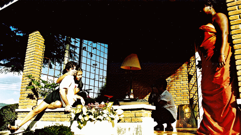 da casa e da vizinhança tomados como locações, tendo árvores, varandas, piscina e até orelhões como elementos cenográficos.